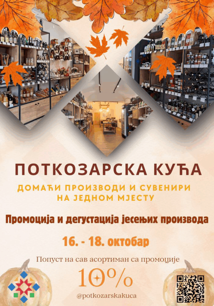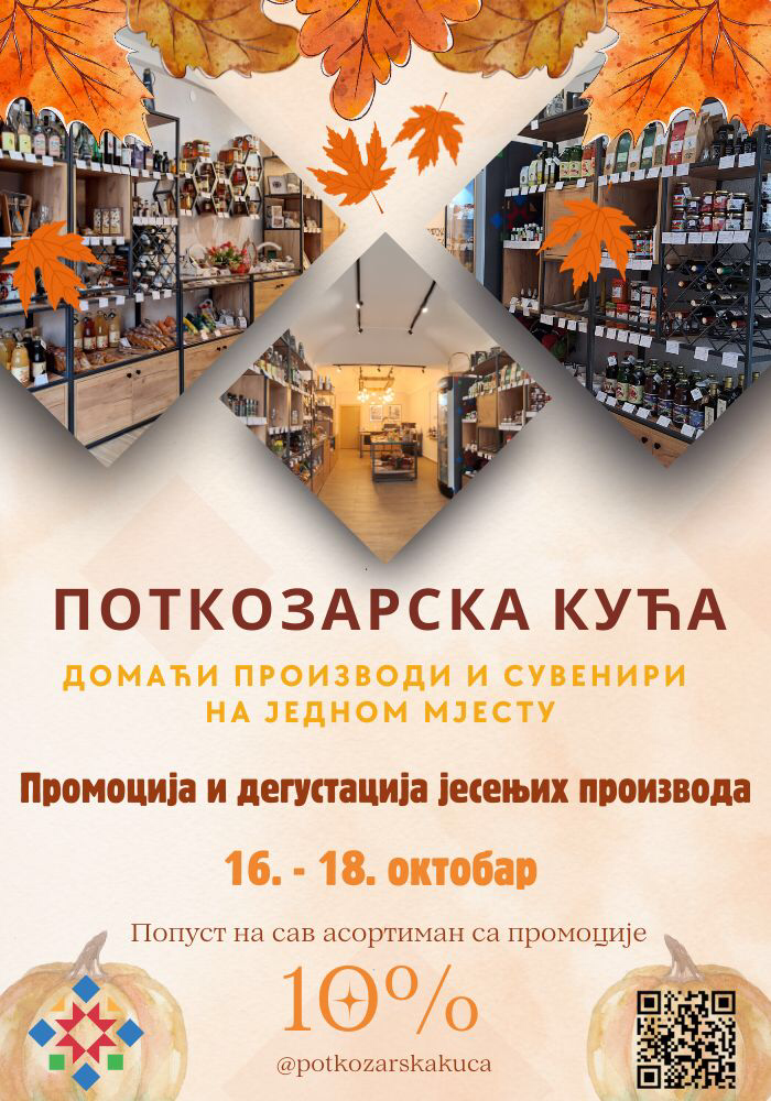 U “Potkozarskoj kući” će od 16. do 18. oktobra biti organizovana jesenja promocija domaćih proizvoda, a tokom sva tri dana promotivne aktivnosti počinju u 10 časova. Za posjetioce je pripremljena bogata ponuda tradicionalnih proizvoda – domaća zimnica, med, sokovi, rukotvorine, prirodna kozmetika i još mnogo toga. Tokom promocije svi će imati priliku da uživaju u degustaciji i ostvare 10% popusta na promotivne proizvode. Poseban dio programa je učešće učenika i profesora prijedorske Poljoprivredno-prehrambene škole, koji će predstaviti svoje domaće proizvode pripremljene po tradicionalnim receptima.