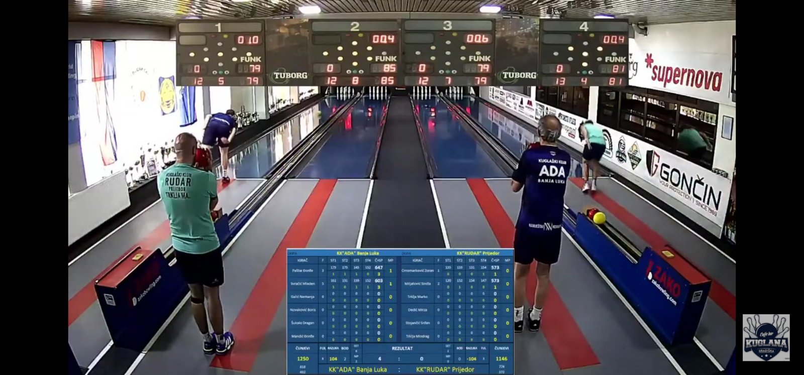 Prvi blok  “Ade”  upravo je to i potvrdio poenima Đorđa Paštara (647) i Mladena Svračića (603) protiv Zorana Crnomarkovića (573) i Siniše Miljatovića (573). Da se nikako ne mire sa porazom daju do znanja u odličnoj predstavi drugog bloka, prvo ime utakmice Marko Trklja (665) i  Mirza Dedić (626),  koji vraćaju “Rudar”  u rezultatski egal protiv Nemanje Galića (603) i Borisa Novakovića (570),  te čak donose i malu čunjsku prednost. U finišu susreta kad su svi očekivali neizvjesnu utakmicu u trećem bloku Srđan Stojančić (578) i Miodrag Trklja (557) ne uspijevaju pružiti značajniji otpor protiv  Dragana Šukala  (596) i Đorđa Mandića (617) koji dolaze do oba meč poena.