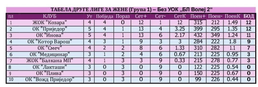 Nakon pet odigranih kola Druge lige za žene (Grupa 1), odbojkašice OK “Prijedor” bilježe četiri pobjede i samo jedan poraz, sa sjajnim set-omjerom 13:4 i ukupno 12 bodova, isto koliko ima i vodeća “Kozara”. Ovim rezultatom OK “Prijedor” potvrđuje odličnu formu i timski duh.