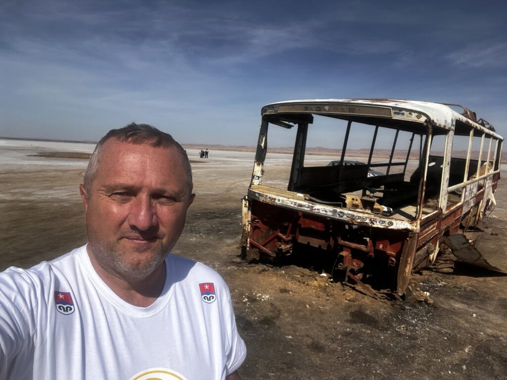 “Po tome vozite sasvim normalno, a čak smo na par mjesta naišli na kostur nekog napuštenog autobusa i devastirani čamac. Interesantno je da Afrikanci iskopaju rupu duboku pola metra u tom jezeru i već se stvori slana voda, koja kad se osuši, ostaje čista sol. Nadrealne su slike iz tog slanog jezera, izgleda kao da lebdite, zato što se bjelina odozdo spaja sa nebom. Potom smo došli do Duza, koji je zadnji grad prije Sahare, a tu prestaje sva civilizacija…”, prenosi utiske Garača.