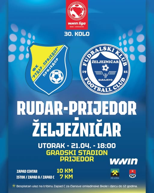 U utakmici 30. kola WWIN lige BiH, na Gradskom stadionu u Prijedoru, “Rudar-Prijedor” sutra igra protiv sarajevskog “Željezničara”. Biće to teška utakmica za Prijedorčane koji se bore za ostanak u Ligi. Susret počinje u 18 časova. Podsjetimo, “Rudar” je u petak u gostima, u uvodnom meču 29. kola, u sudijskoj nadoknadi savladao “Široki Brijeg” sa 1:0.