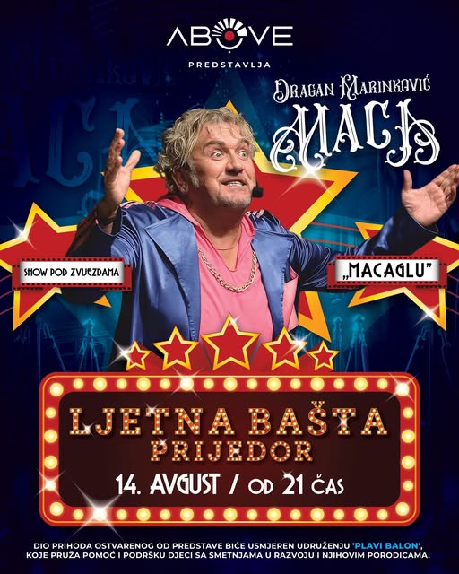 Stand up komedijom „Macaglu“, u Ljetnoj bašti, s početkom u 21 čas, večeras će se publici predstaviti jedan od naših najpoznatijih glumaca i šoumena Dragan Marinković Maca. Šou organizuje Agencija „Above“ a njen vlasnik Luka Goronja poziva ljubitelje kvalitetnog humora na dobru zabavu.