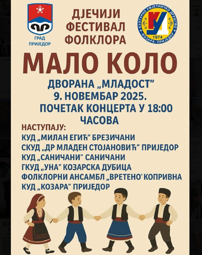 U organizaciji KUD-a “Kozara”, Prijedor, sutra će u Dvorani “Mladost” biti održan tradicionalni Dječiji festival folklora “Malo kolo”. Pored domaćina, nastupiće kulturno-umjetnička društva “Milan Egić, Brezičani, i “Saničani”, Folklorni anambl “Vreteno”, Koprivna, SKUD “Dr Mladen Stojanović”, Prijedor, i GKUD “Una”, K. Dubica. Koncert počinje u 18 časova.