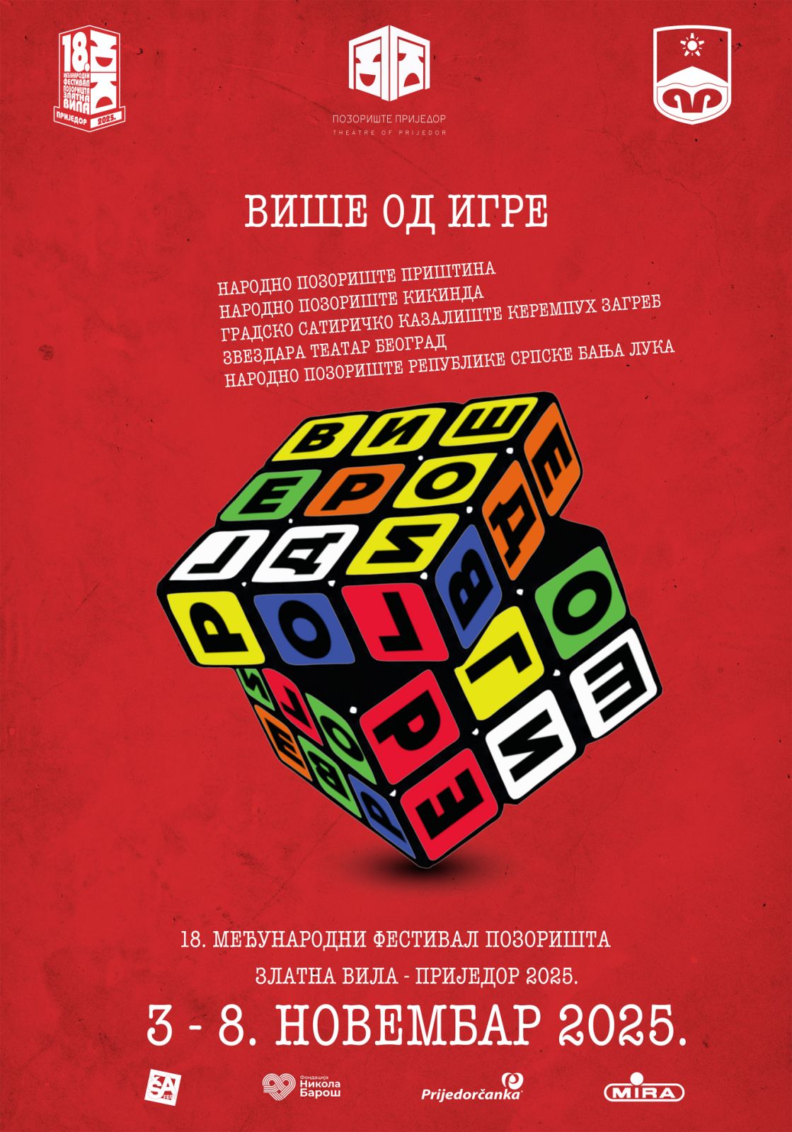 U ponedjeljak, 3. novembra, u Prijedoru počinje 18. međunarodni festival pozorišta “Zlatna vila”, koji se ove godine održava pod motom “Više od igre”. Selektor Aleksandar Stojković Piksi, od dvadesetak predstava odabrao je pet, u izvođenju pozorišta iz Prištine, Kikinde, Beograda, Zagreba i Banjaluke. Festival otvara predstava “Hamlet u selu Mrduša Donja” u izvođenju ansambla Narodnog pozorišta Priština, a dan kasnije će Narodno pozorište Kikinda igrati komad “Srbija all inclusive”. U srijedu, 5. novembra, na repertoaru je “Smrt na dopustu” zagrebačkog Satiričkog kazališta “Kerempuh”, dok će u četvrtak biti odigran komad “Majstori, majstori” Narodnog pozorišta Republike Srpske. Takmičarski dio Festivala u petak će zatvoriti beogradski “Zvezdara teatar” predstavom “Udovica živog čoveka”. Sve predstave u Pozorištu Prijedor počinju u 20 časova. “Zlatna vila” traje do subote, 8. novembra, kada će biti održan koncert gudačkog orkestra Narodnog pozorišta Republike Srpske i uručene nagrade. Za ovogodišnju “Zlatnu vilu” iz gradskog budžeta izdvojeno je 100.000 maraka.