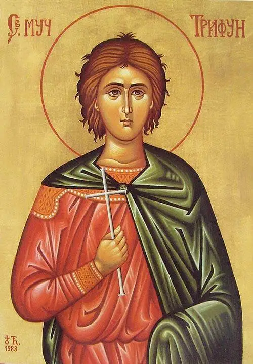 Na liturgijama u pravoslavnim hramovima, u pravoslavnim domovima, vinogradarskim i gostioničarskim esnafima pominje da je svetitelj Trifun stradao 250. godine u Nikeji od mača hristobornog rimskog cara Dakija.
