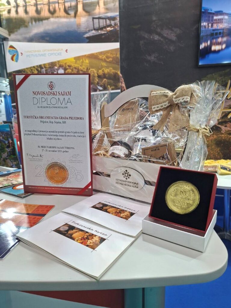 Turistička organizacija grada Prijedora dobila je prestižno priznanje na 56. Međunarodnom sajmu turizma u Novom Sadu – Diplomu sa velikom zlatnom medaljom za unapređenje i promociju autentične turističke ponude kroz projekat “Potkozarska kuća”, kao i za doprinos valorizaciji domaćih proizvoda, tradicije i lokalne zajednice. Na sajmu, koji se održava od 27. do 29. novembra, Turistička organizacija grada Prijedora predstavlja turističku ponudu ovog kraja u saradnji s Turističkom organizacijom Republike Srpske. Na zajedničkom štandu izloženi su promotivni materijali i autentični proizvodi “Potkozarske kuće”, koji su privukli veliku pažnju posjetilaca. Prestižno priznanje potvrđuje kontinuirani rad Turističke organizacije grada Prijedora na očuvanju i predstavljanju bogate potkozarske tradicije, te još jednom ističe važnost ovog projekta u razvoju lokalnog turizma.