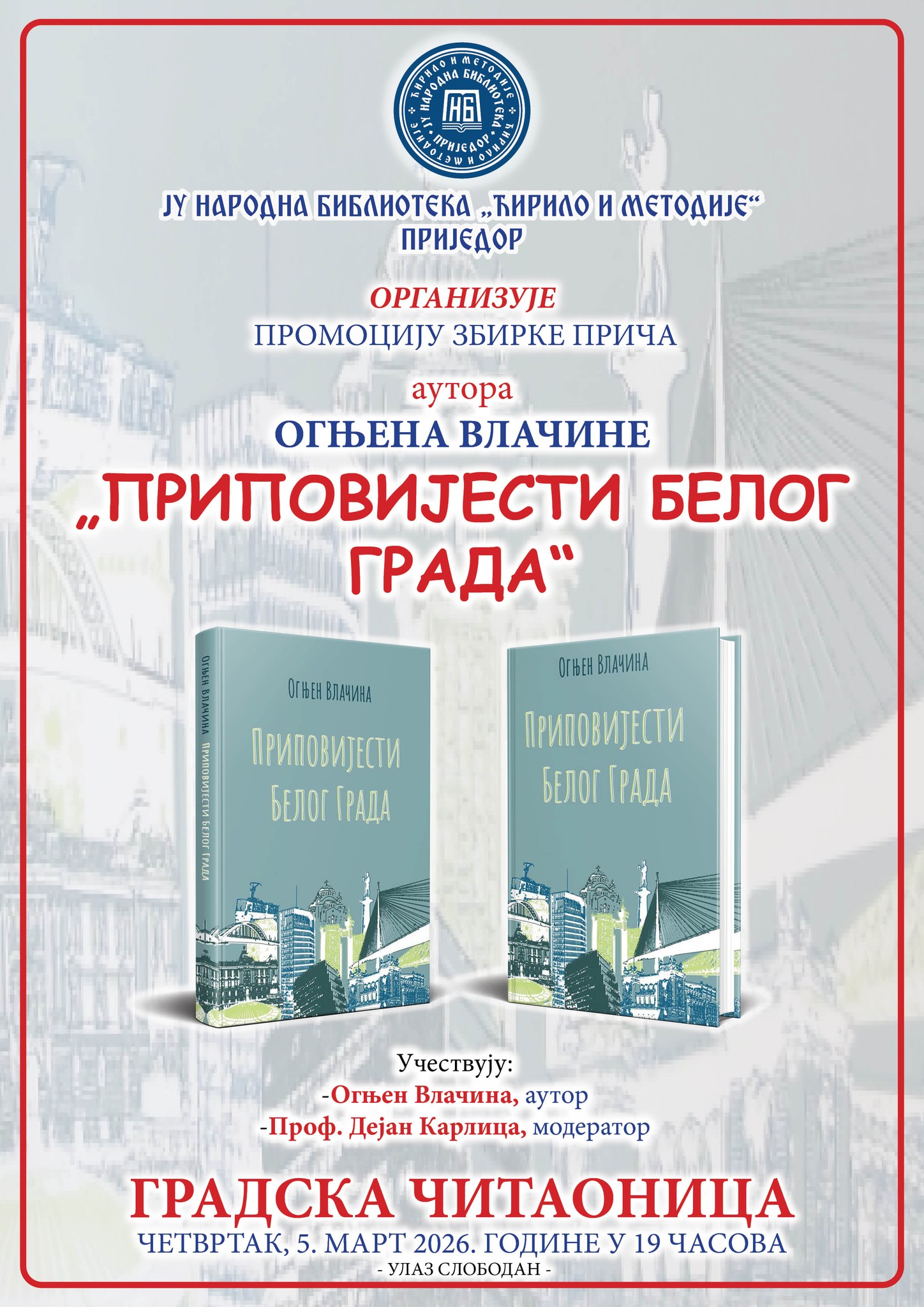 U organizaciji Narodne biblioteke “Ćirilo i Metodije” u četvrtak, 5. marta, u Gradskoj čitaonici biće promovisana zbirka priča Ognjena Vlačine pod nazivom “Pripovijesti Belog Grada”. Osim autora, na promociji će govoriti moderator Dejan Karlica. Književno veče biće održano s početkom u 19 časova.