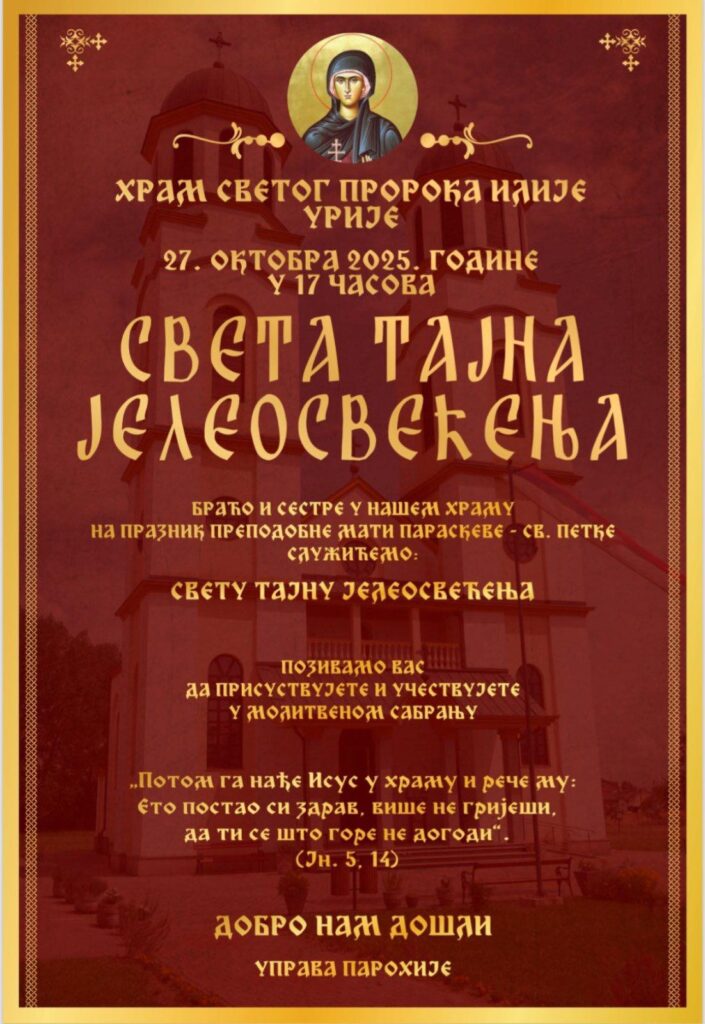 U ponedjeljak, 27. oktobra, na praznik Svete Petke, u hramu Svetog proroka Ilije na Urijama biće služena Sveta tajna Jeleosvećenja, uz sasluženje sedam sveštenika.