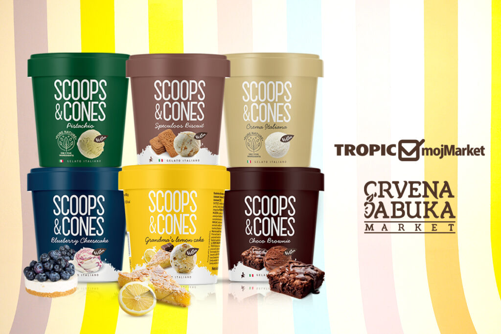 Dostupni isključivo u Tropic, mojMarket i Crvena jabuka marketima, “Scoops & Cones” sladoledi spajaju najbolje od dvije tradicije – kremastu strukturu klasičnog ice cream-a i bogatstvo ukusa autentičnog italijanskog gelato sladoleda. Njihova pažljivo osmišljena receptura pruža idealan balans između laganog osvježenja i intenzivnog, punog ukusa. U ponudi je šest neodoljivih varijanti – svaka od njih kreirana s posebnom pažnjom. Voćna svježina Blueberry Cheesecake-a, aromatični Speculous Biscuit ili raskošni Choco Brownie – za različite ukuse i raspoloženja.