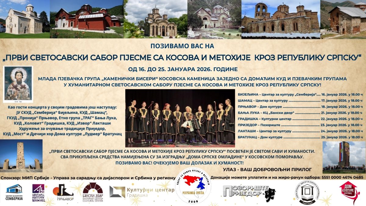 Odbor za pomoć Kosovu i Metohiji iz Banje Luke, u okviru niza humanitarnih aktivnosti posvećenih očuvanju duhovne i kulturne baštine srpskog naroda na Kosovu i Metohiji, organizuje Svetosavski sabor pjesme s Kosova i Metohije kroz Republiku Srpsku. Ovaj jedinstveni sabor održava se u osam gradova Republike Srpske – Bijeljini, Šamcu, Prnjavoru, Banjaluci, Gradišci, Prijedoru, Laktašima i Bratuncu.